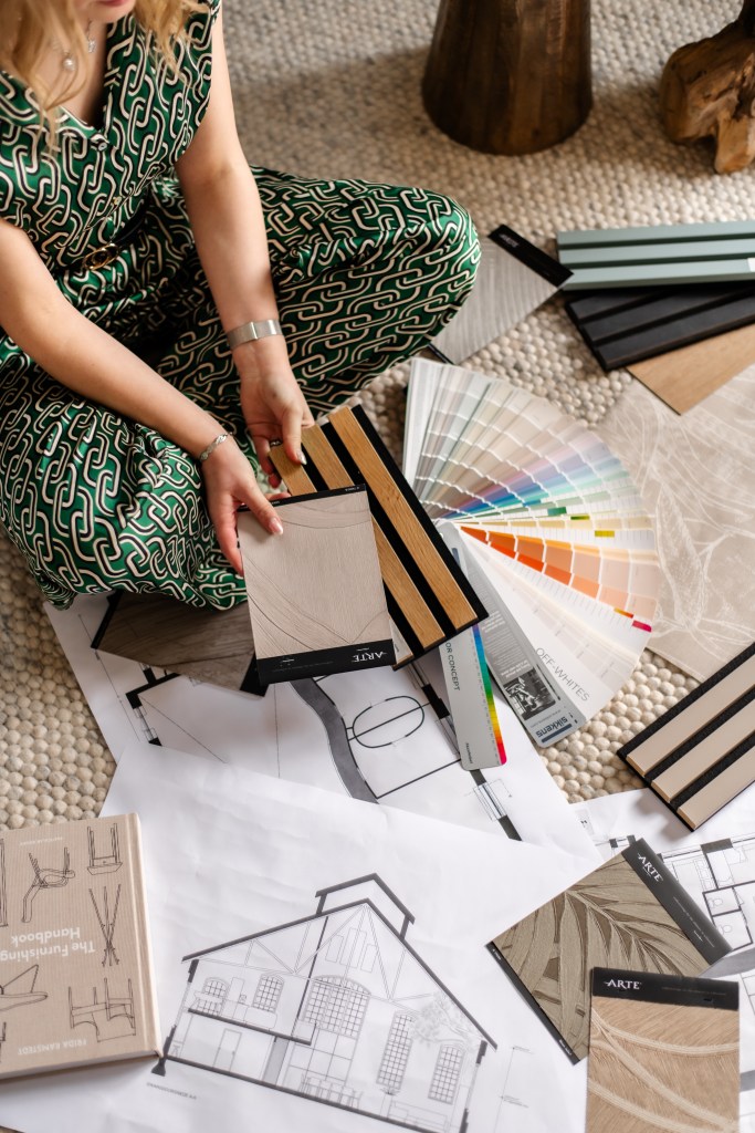 Vooraf vul je een korte vragenlijst in, zodat ik weet wie jij bent, hoe je woont en waar je van houdt. Op basis daarvan neem ik een berg aan kleur- en materiaalstalen, voorbeelden en inspiratiemateriaal mee. Denk aan stoffen, houtsoorten, verfstalen, prints, texturen, kleuren… alles wat je kunt voelen, combineren en selecteren.